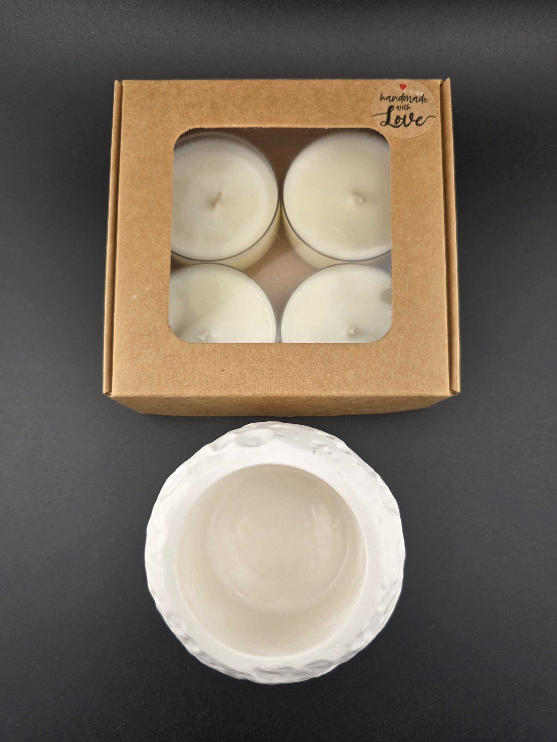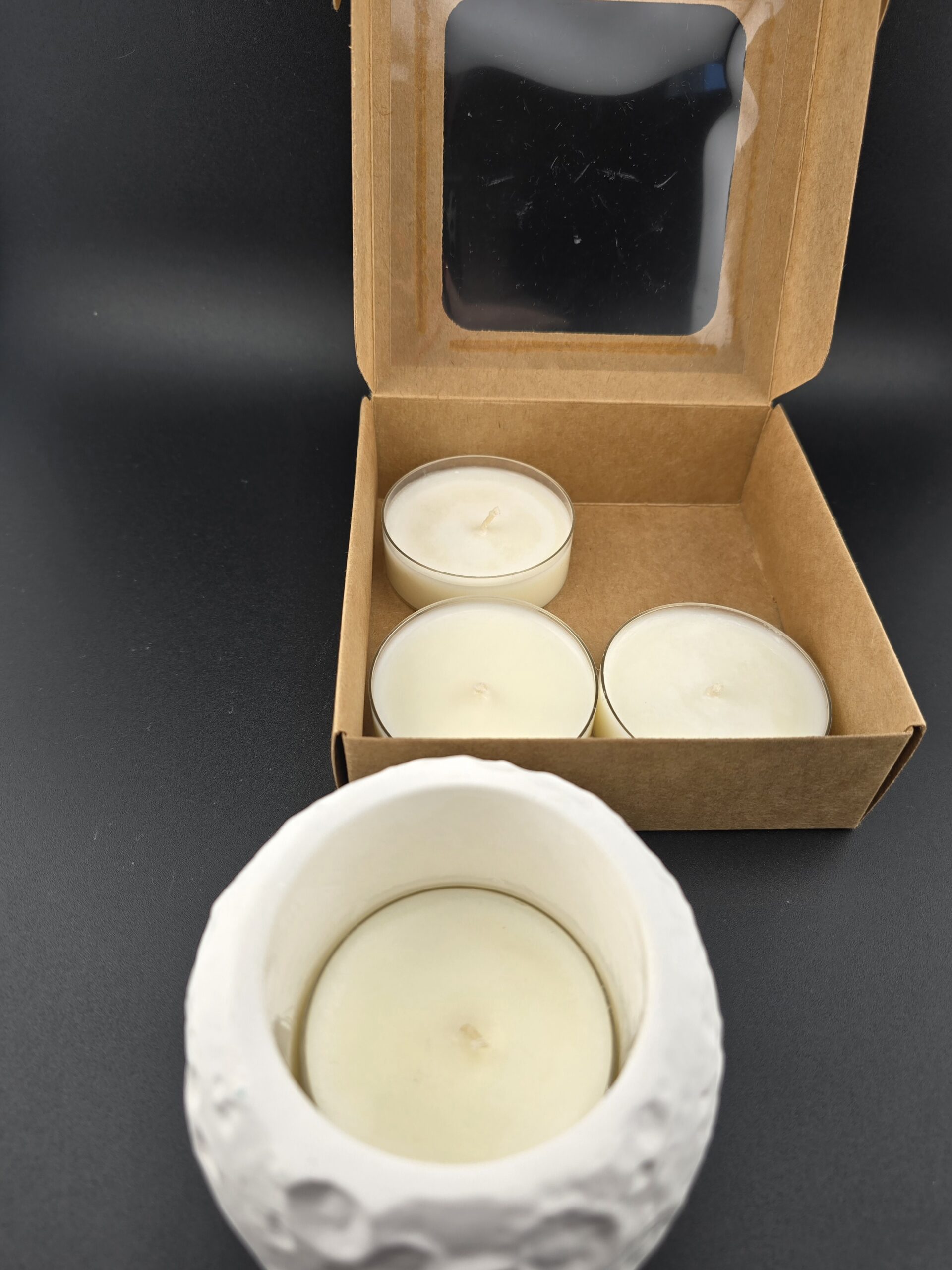 Entdecke unsere Düfte auf eine besondere Art: In diesem Set erhältst du ein handgefertigtes Gipsgefäß im einzigartigen Mondkrater-Design sowie 4 Sojawachs-Teelichter – jedes mit einem anderen Duft. So kannst du unsere Kompositionen ausprobieren und deinen Favoriten finden.