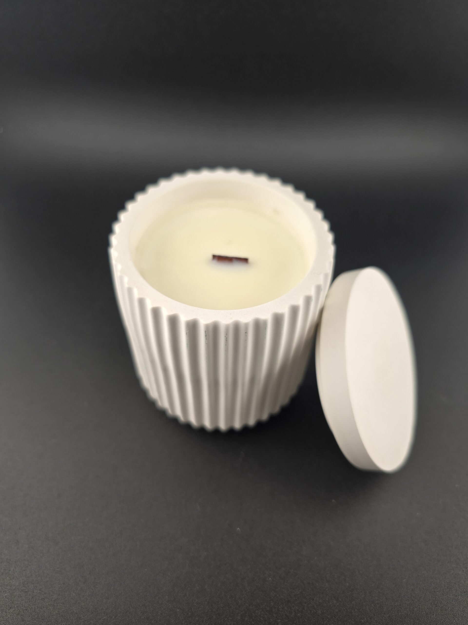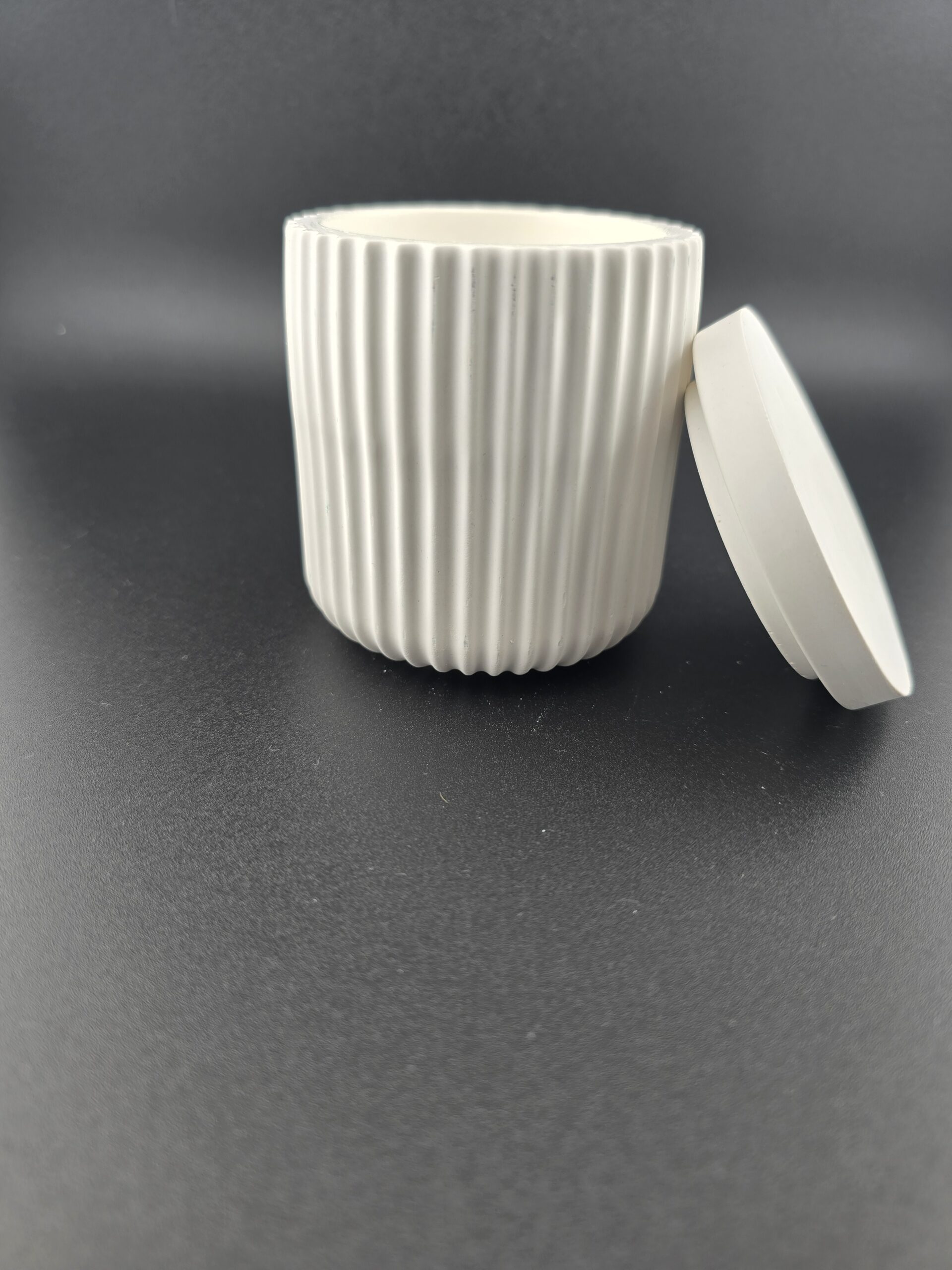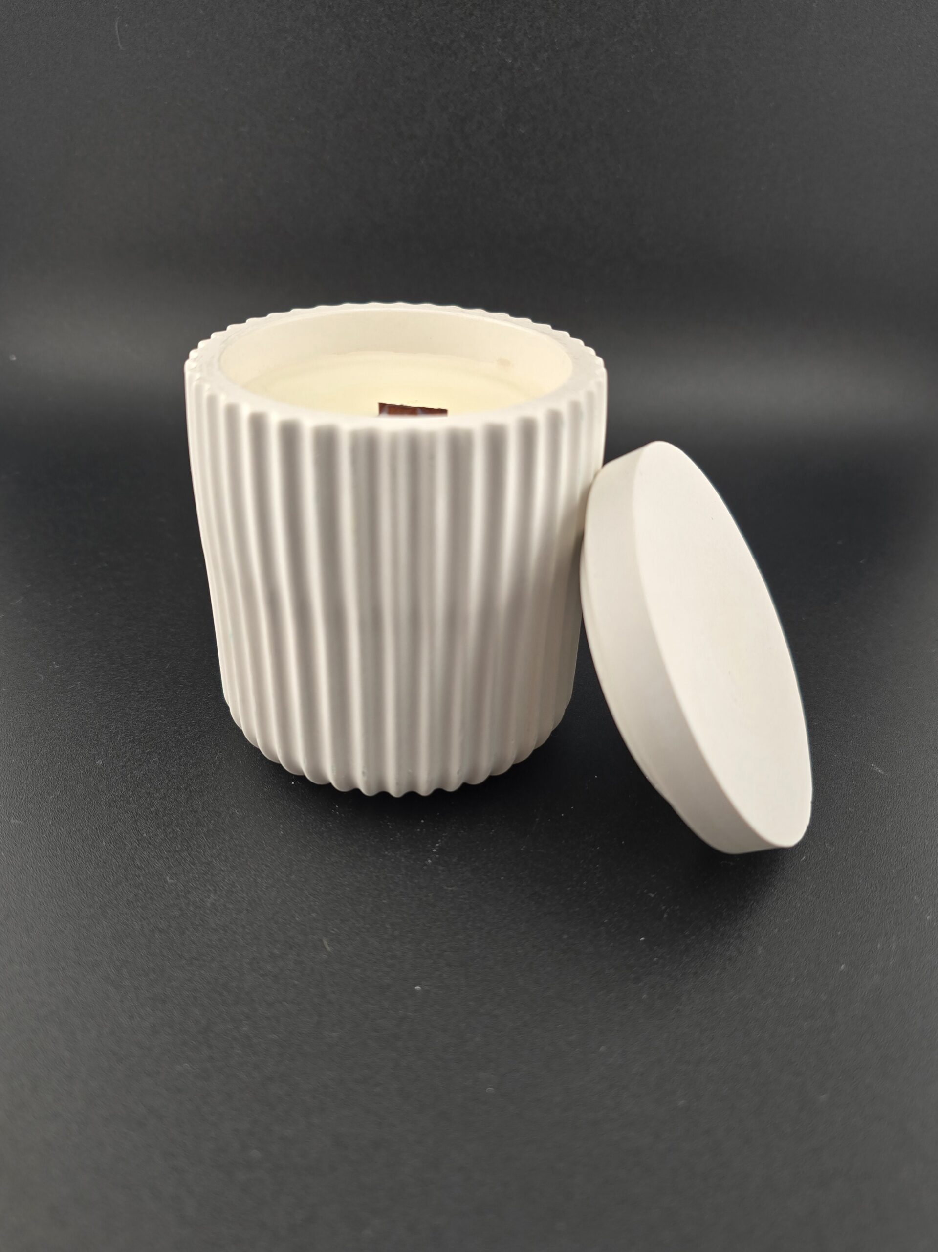 Sojakerze im geriffelten Gipsgefäß mit Deckel