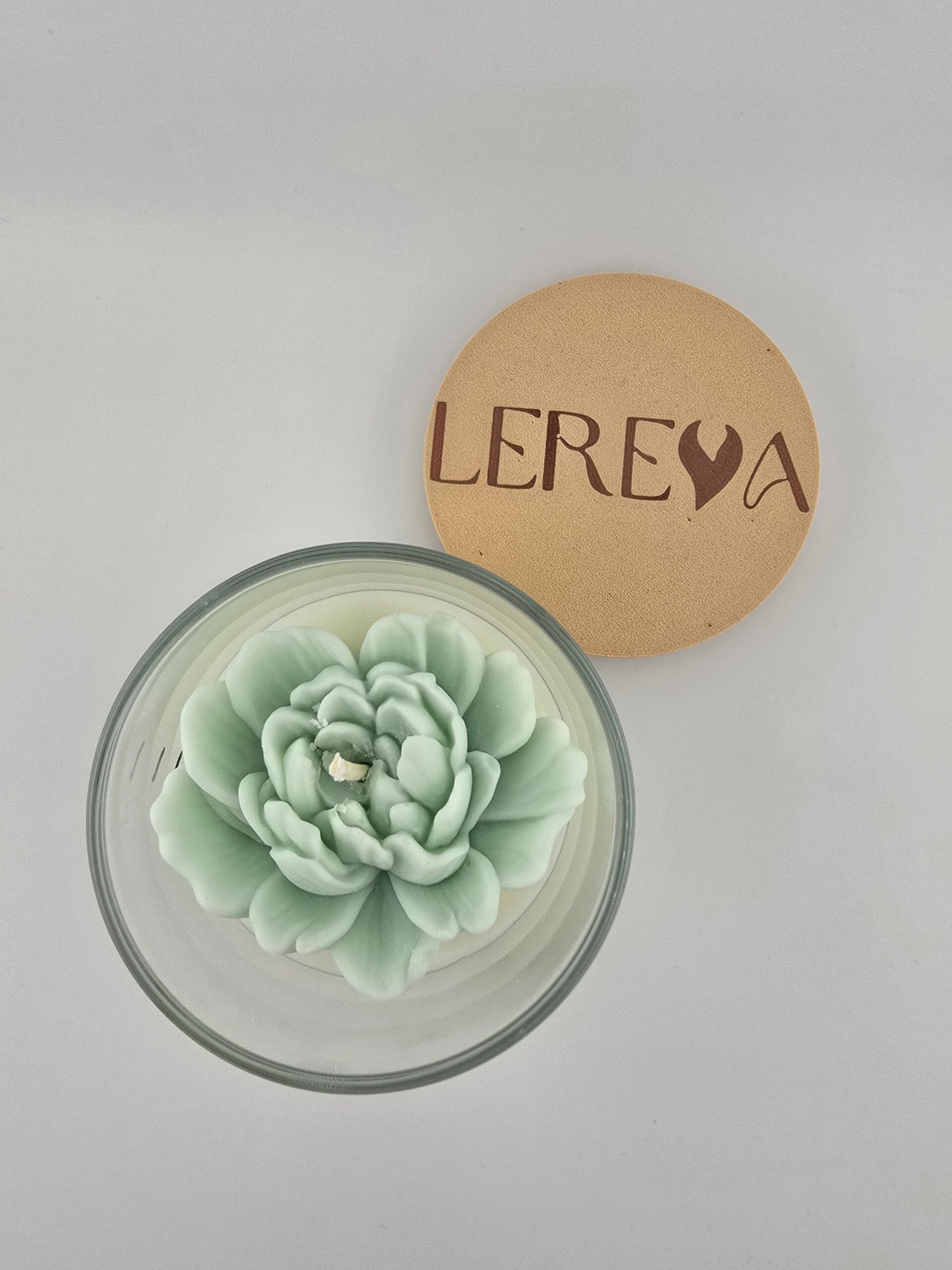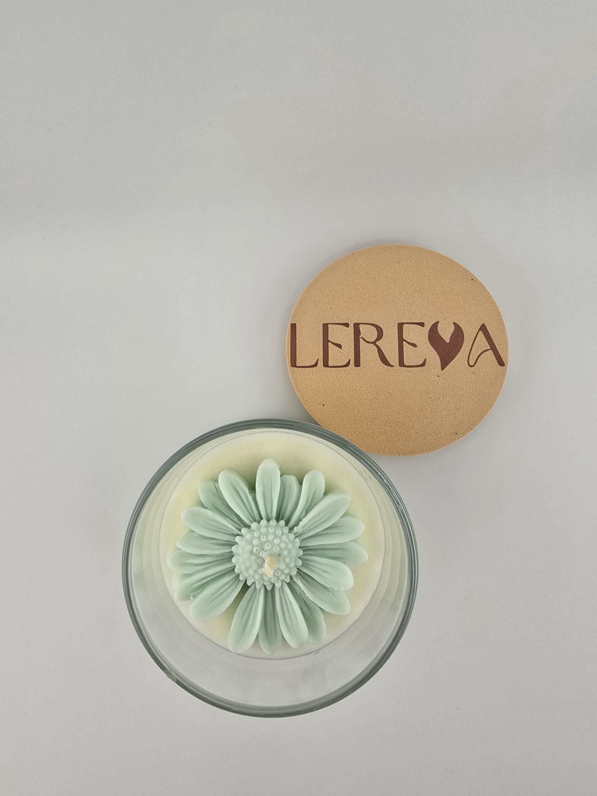 Verziert ist die Kerze mit einer kleinen türkisfarbenen Blume.